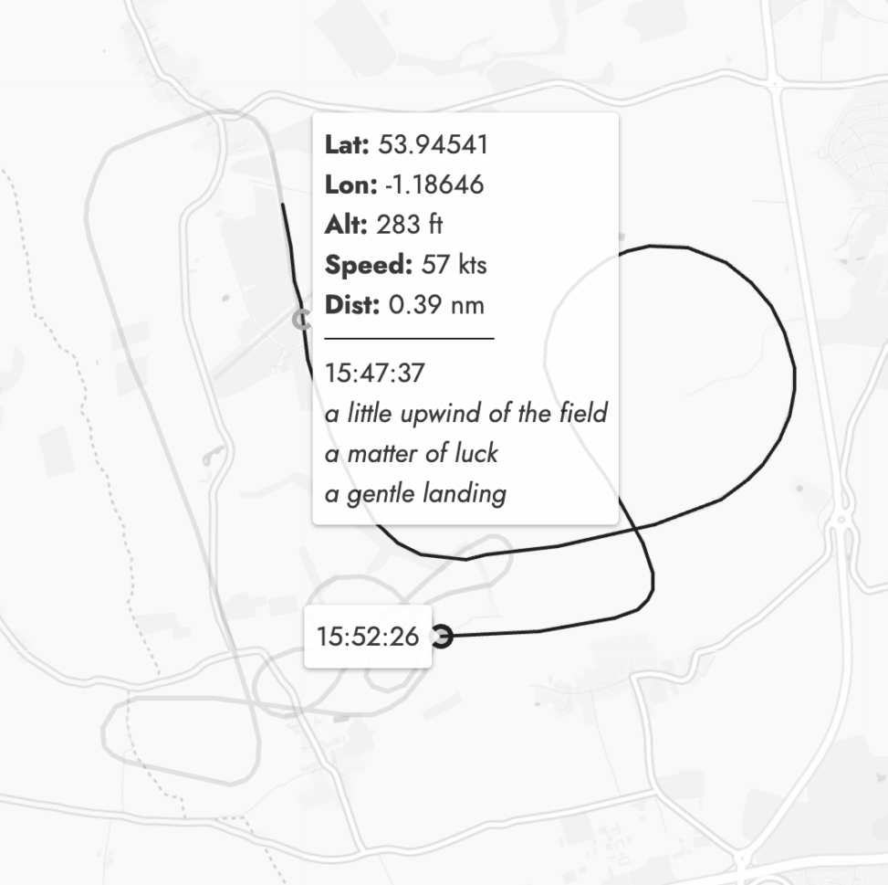 Flight Diaries is an interactive digital poem built around GPS recordings of the author's glider flights in 2024-25. The tracking data of each flight is visualised as a tracing overlaid onto a map of the area it traversed, and viewer's can trace their cursor over the rendered path to retrieve data associated with each moment of flight, along with a short poem that is generated using this information.